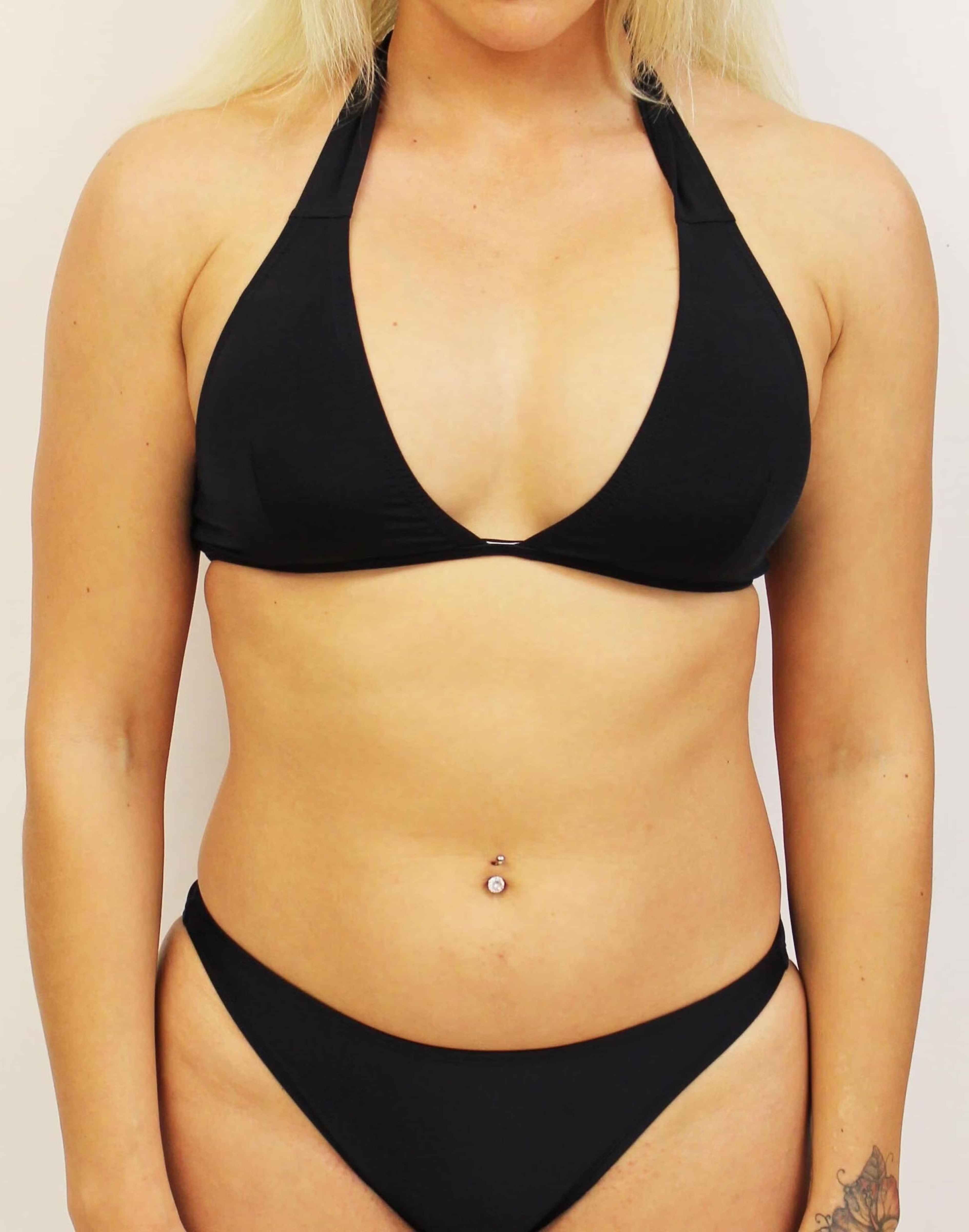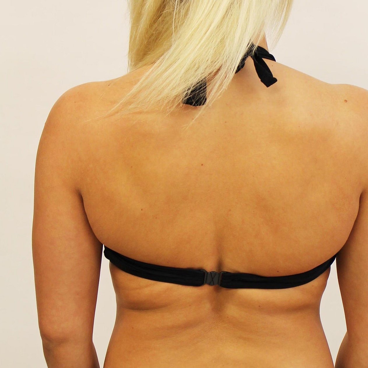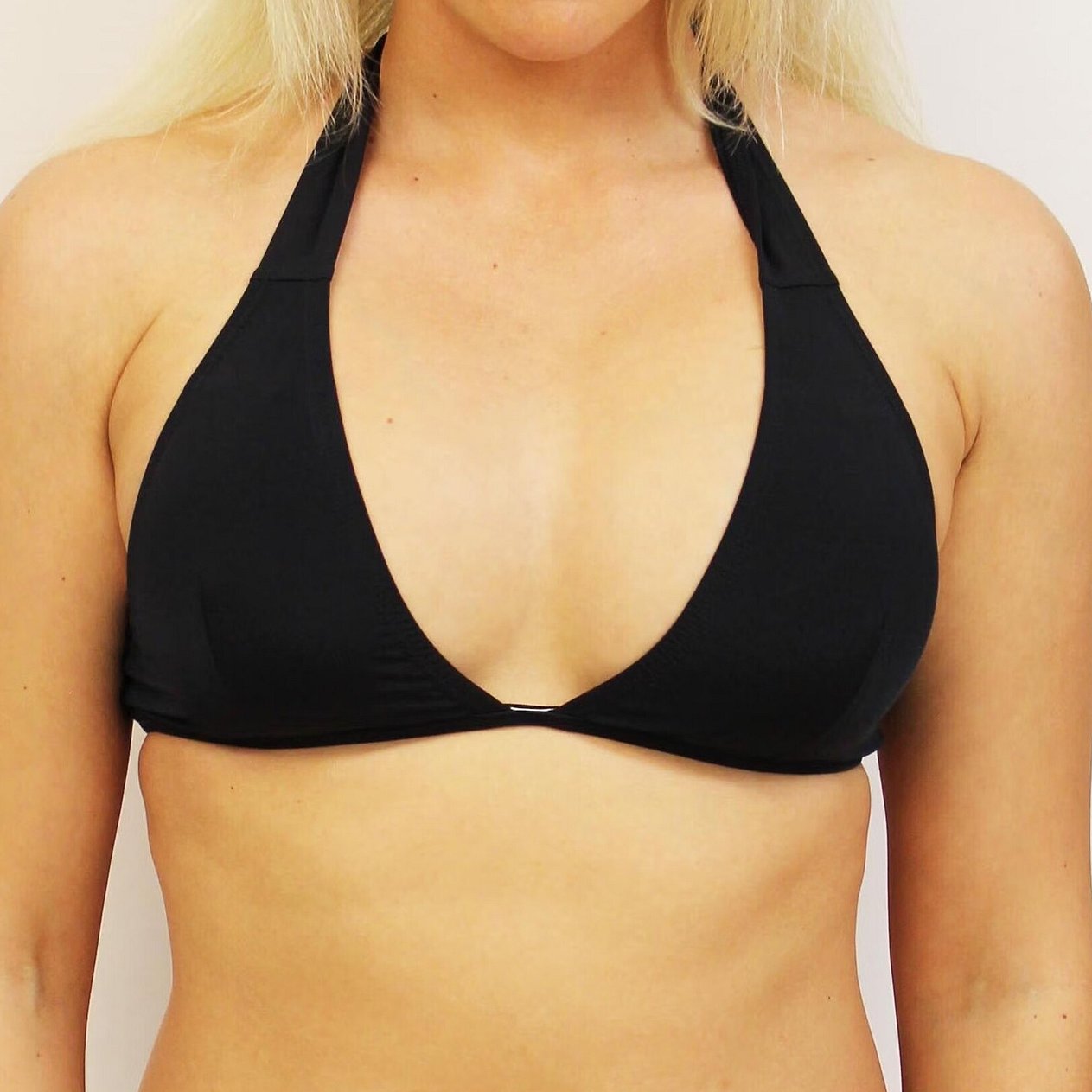 Shaped bikini top with neck ties and clasp on back. Has pockets in the cups so that a soft cup can be added. Suitable for a B-C cup.
