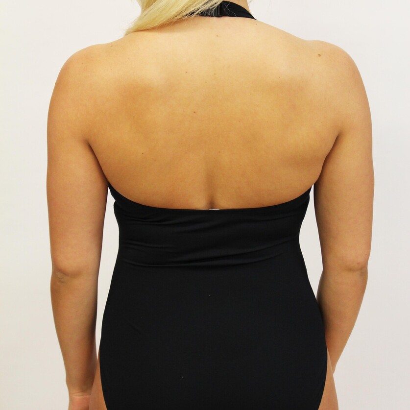 The Amy One Piece suit is a halter neck style, it has an underwire and is available in a C to a DD cup. This style had a plunging neckline (for those wanting more coverage in this area, please see the Lola One Piece suit).