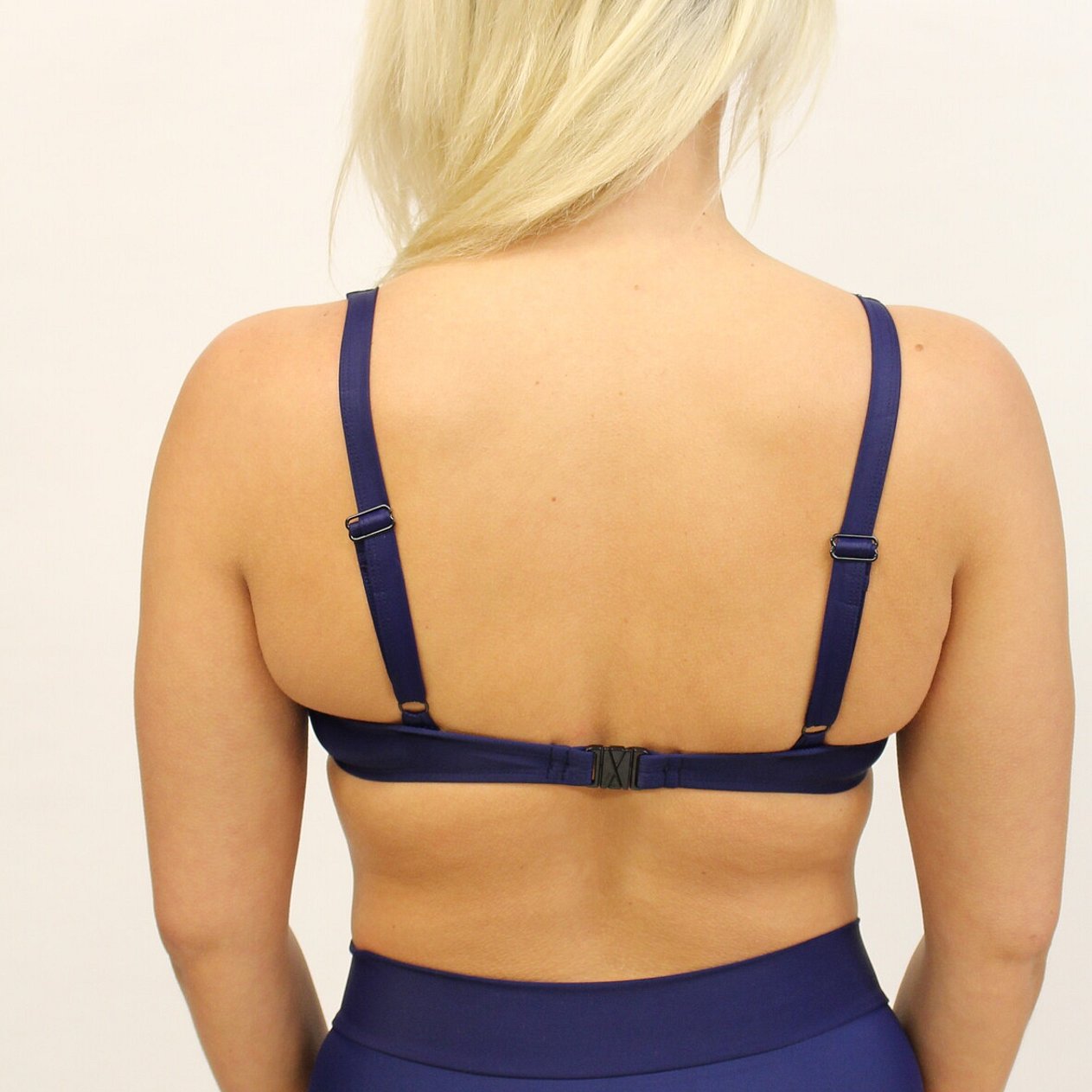 Underwire bikini top with over the shoulder straps and a clasp back. It has three decorative coloured loops at the top of the cups, which can be moved up or down to make the cup size adjustable. It also has the three loops on the centre front. It has pockets in the cups so that a soft cup can be added. Suitable for a C-D cup.