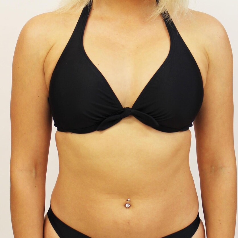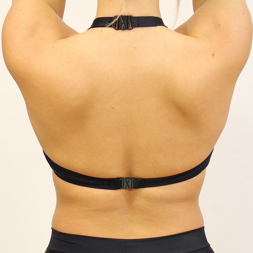Underwire bikini top with a clasp at the back of the neck and a clasp on the back strap. It has a pocket in the cups so a soft cup can be added.