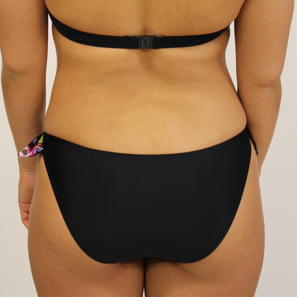 This style sits low, just on the hip bone. It has a medium legline and good coverage across the seat. It has decorative contrast trim bows on each hip, these bows are removable so you can wear them with or without the bows. We have this style available in black online and you can have the contrast bows to match the colour of your top, in any one of our available colours.