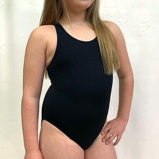 Monica has a high neckline with a clasp at the nape of the neck. The back has a large cut out. This style has a mid to high legline.