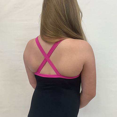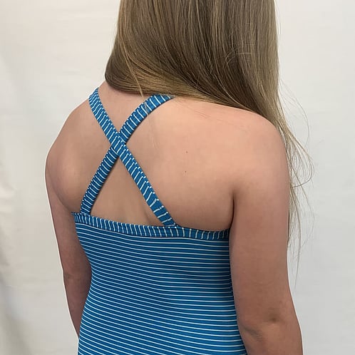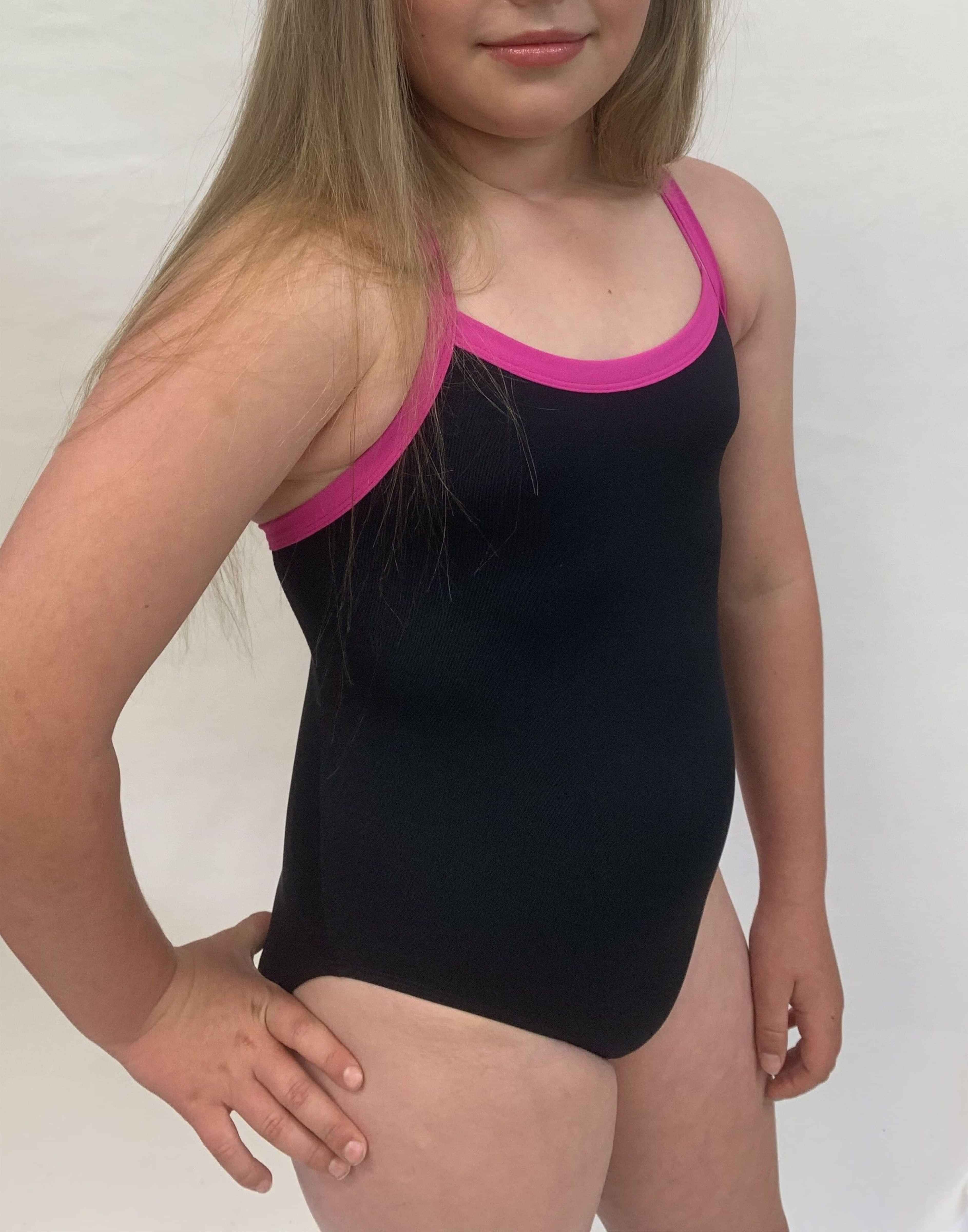 Stella is a solid colour with a bound edge. It has a crossover shoulder strap design. It has a mid cut legline. It has extra length on the shoulder straps so it can be lengthened.
