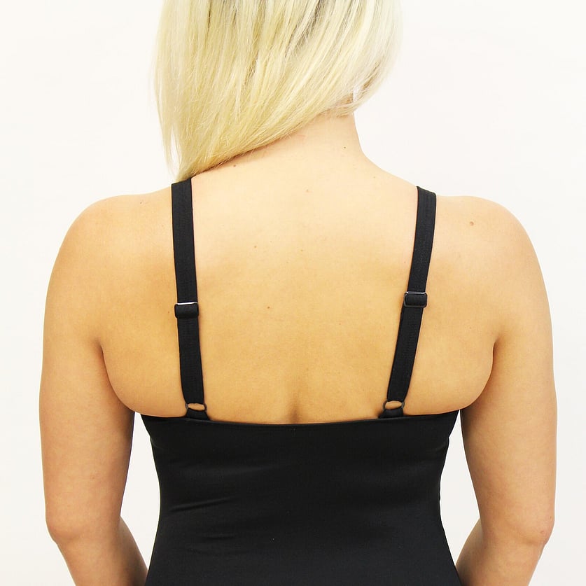 This style has over the shoulder straps for extra support for a larger bust and slides that make it adjustable. This suit also has extra support across the back on the inside to add extra support for the underwires.
