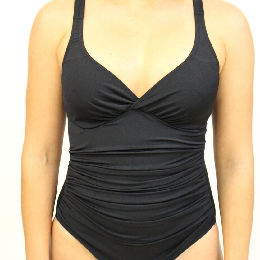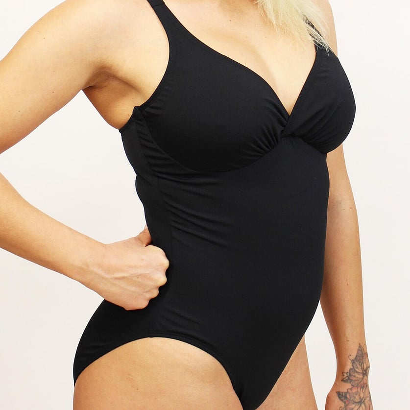 The Lola One Piece suit has a small crossover at the centre front of the bust, it is not too plunging and gives more coverage than the Amy One Piece style. It is available in a C to DD cup, it has pockets in the cup so that you can add soft cups in there if you would like to. Lola has a flat front and a mid height leg line and good coverage across the seat.