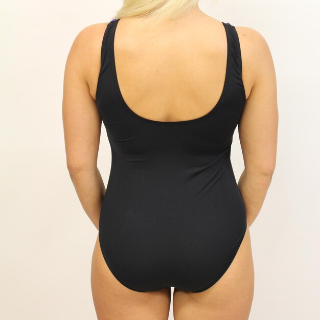 This suit has a rouched centre front panel making it very flattering. We make it either with a contrasting colour or a solid colour. It has a soft cup, which is stitched in so it doesn’t move around while swimming. It is not removable. It has a low leg line and a medium height back. It also has wider shoulder straps for support. All of the colour options online are chlorine resistant fabric.
