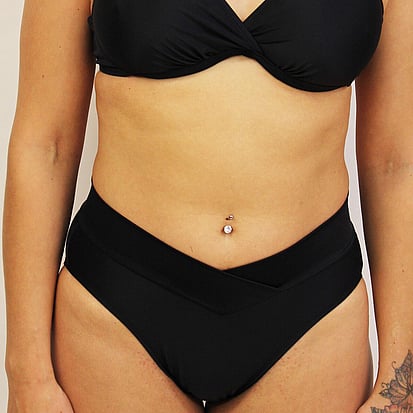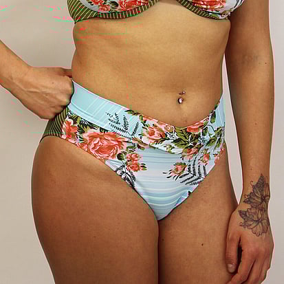 This is our most popular style! A medium height pant sitting under the belly button with a V shaped crossover on the band at the front. It has a medium legline and good coverage across the seat. The band on this style sits nice and softly and does not cause the dreaded ‘muffin top’ that styles with a rubber edge sometimes can.